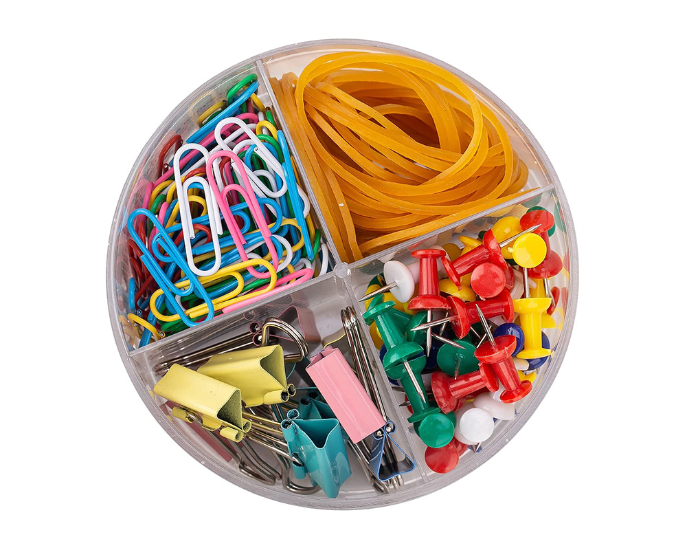 Το σετ περιλαμβάνει: 100 συνδετήρες, 50 καρφίτσες-πιόνια, 40 λάστιχα (12γρ.), 10 πιάστρες-κλιπ.